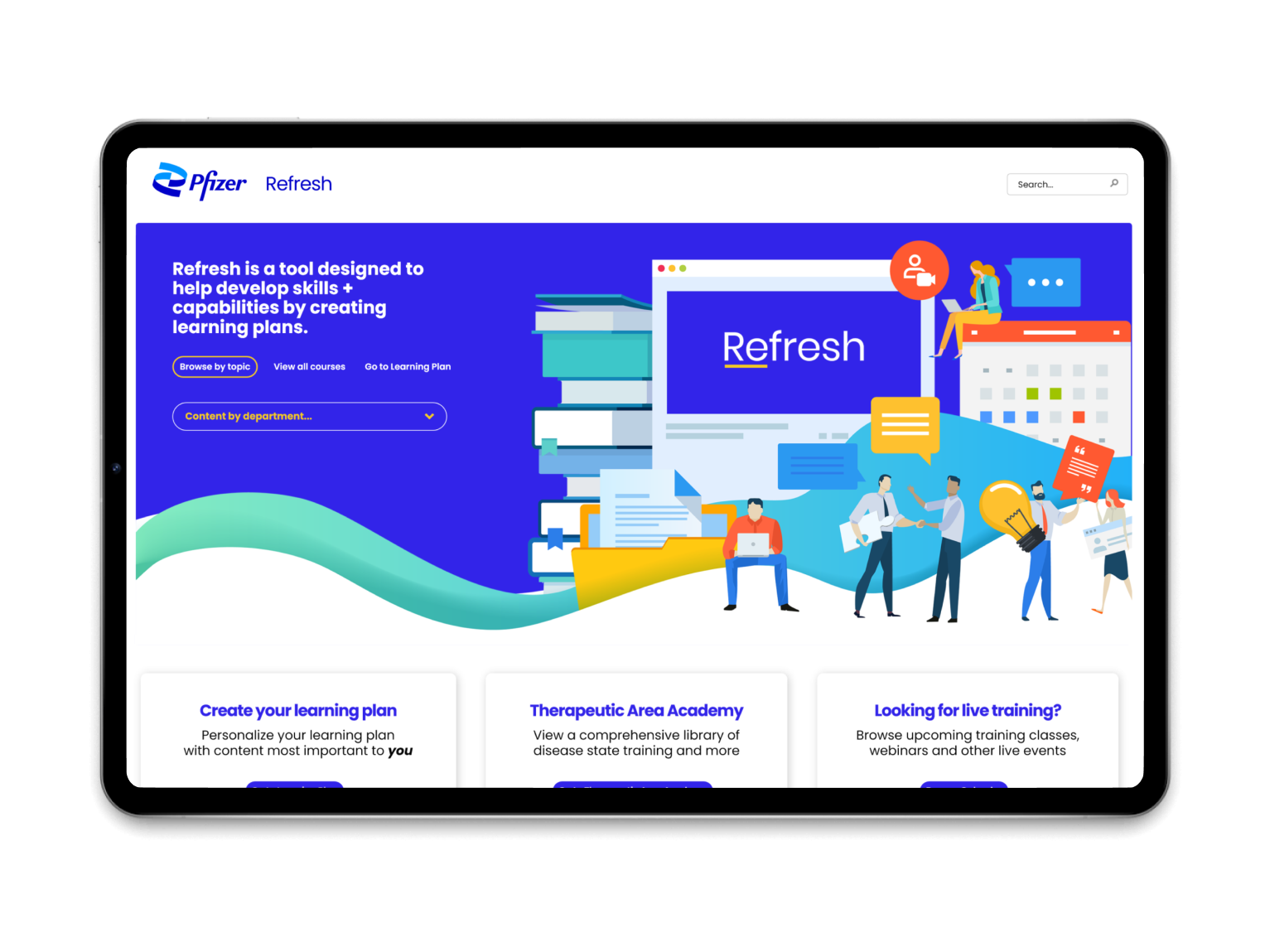Pfizer employees struggled to locate valuable elective training materials, spending considerable time searching across fragmented sources. Professional development resources were scattered and difficult to discover, leading to low engagement in self-directed learning.